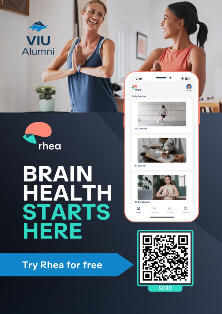 Rhea Health is offering free access to our Brain Health App for 3 months, exclusively for Vancouver Island University Alumni.